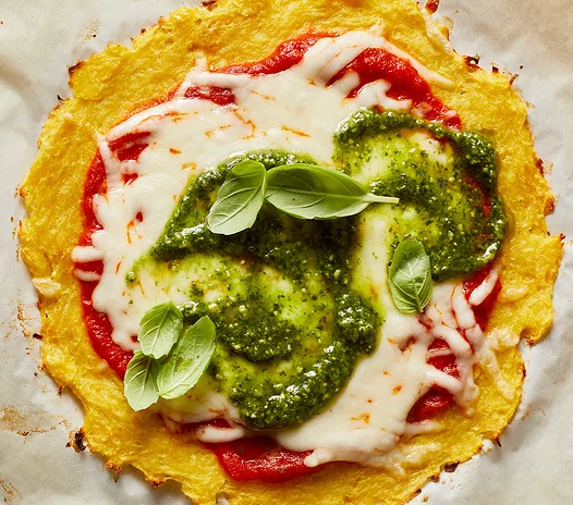 Απλώστε ομοιόμορφα την σάλτσα ντομάτας και τη μοτσαρέλα στις βάσεις πίτσας από κολοκύθα. Ξαναβάζουμε στο φούρνο και ψήνουμε στους 230 βαθμούς C έως ότου η μοτσαρέλα λιώσει, για 5 έως 6 λεπτά. Απλώνουμε ομοιόμορφα το πέστο και πασπαλίζουμε με βασιλικό.