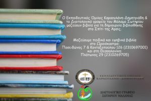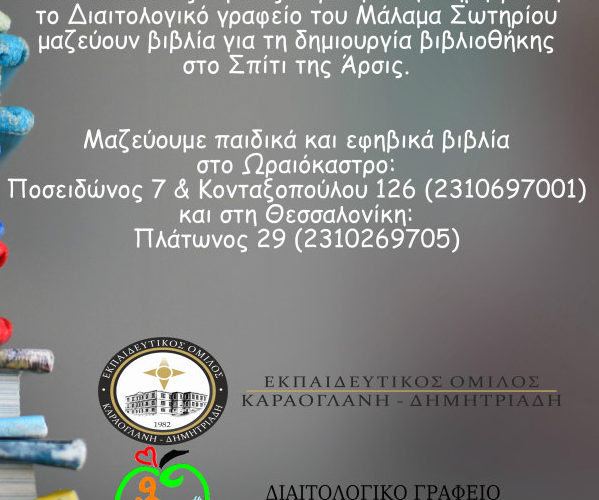 Με τον φίλο Δημητριάδη Χρήστο του Εκπαιδευτικού Ομίλου Καραογλάνη-Δημητριάδη αποφασίσαμε να βοηθήσουμε έναν σκοπό που και οι δυο μας θαρρώ πως θεωρούμε ιερό. Τη δημιουργία μιας βιβλιοθήκης. Της βιβλιοθήκης του Σπιτιού της Άρσις. Εκτός από αυτά που θα προσφέρουμε, και οι δύο θα δεχόμαστε την δική σας συνεισφορά. Τις μέρες των γιορτών, θα προσφέρουμε στα παιδιά στο Σπίτι της Άρσις τα βιβλία. Βιβλία για παιδιά και για εφήβους.